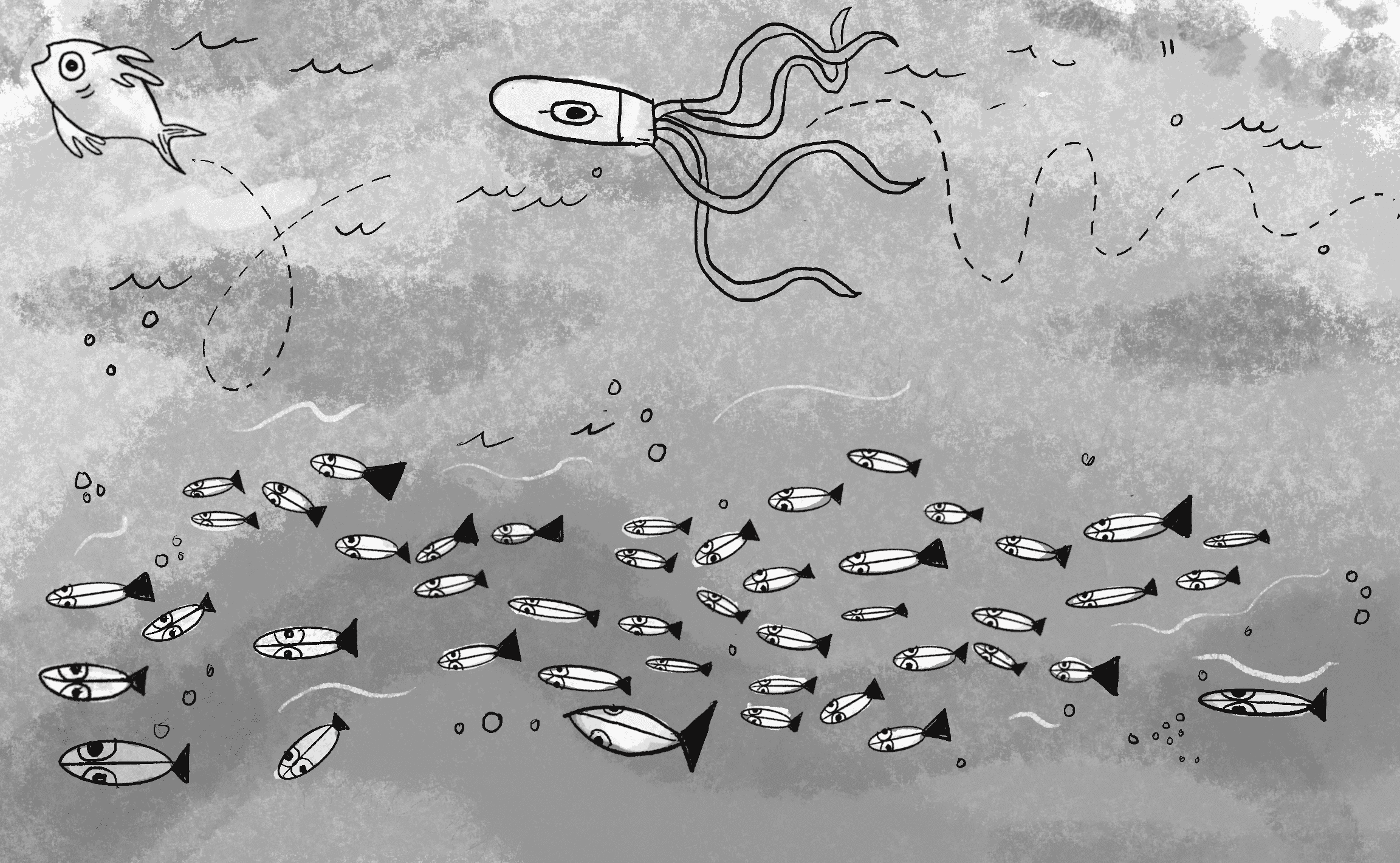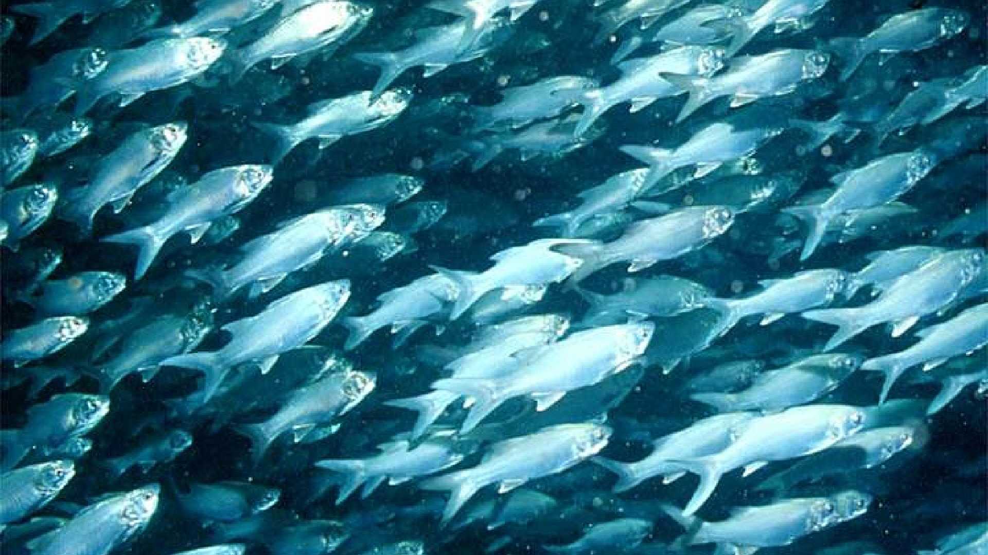 Six-finger threadfins (Polydactylus sexfilis), also known as fish of kings, or mo’i, in Hawaiian, are shown swimming in a shoal. The mo’i fish held a special status for Hawaiian royalty and were raised in dedicated ponds to ensure their population growth and prevent their extinction. The fish display a delicate and coordinated dance in their collective movement, with each individual mo’i subtly influencing and being influenced by its neighboring fish.