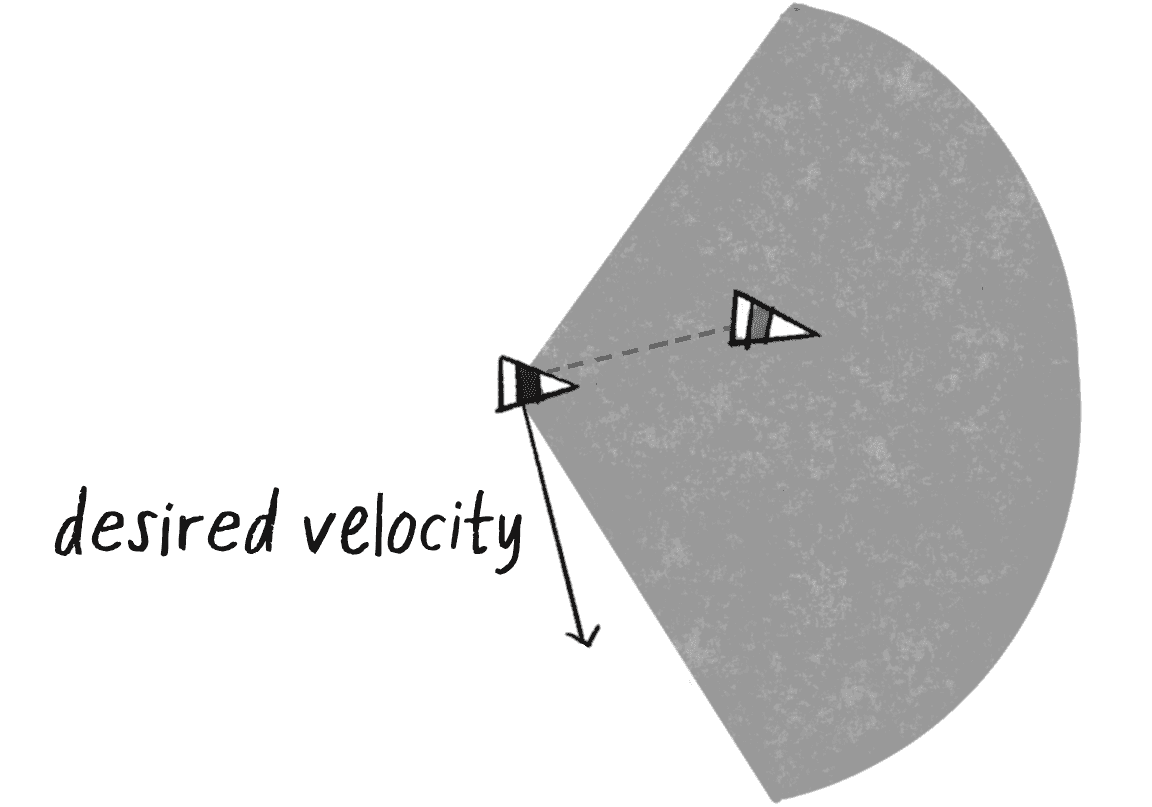 This force looks quite different from gravitational attraction. Remember one of the principles of autonomous agents: an autonomous agent has a limited ability to perceive its environment, including its own state. Here’s that ability, subtly but powerfully embedded into Reynolds’s steering formula. In the case of gravitational attraction, the force pulling an object toward another is the same regardless of how that object is moving. But here, the vehicle is actively aware of its own velocity, and its steering force compensates accordingly. This adds a lifelike quality to the simulation, as the way in which the vehicle moves toward the target depends on its own understanding of its current motion.