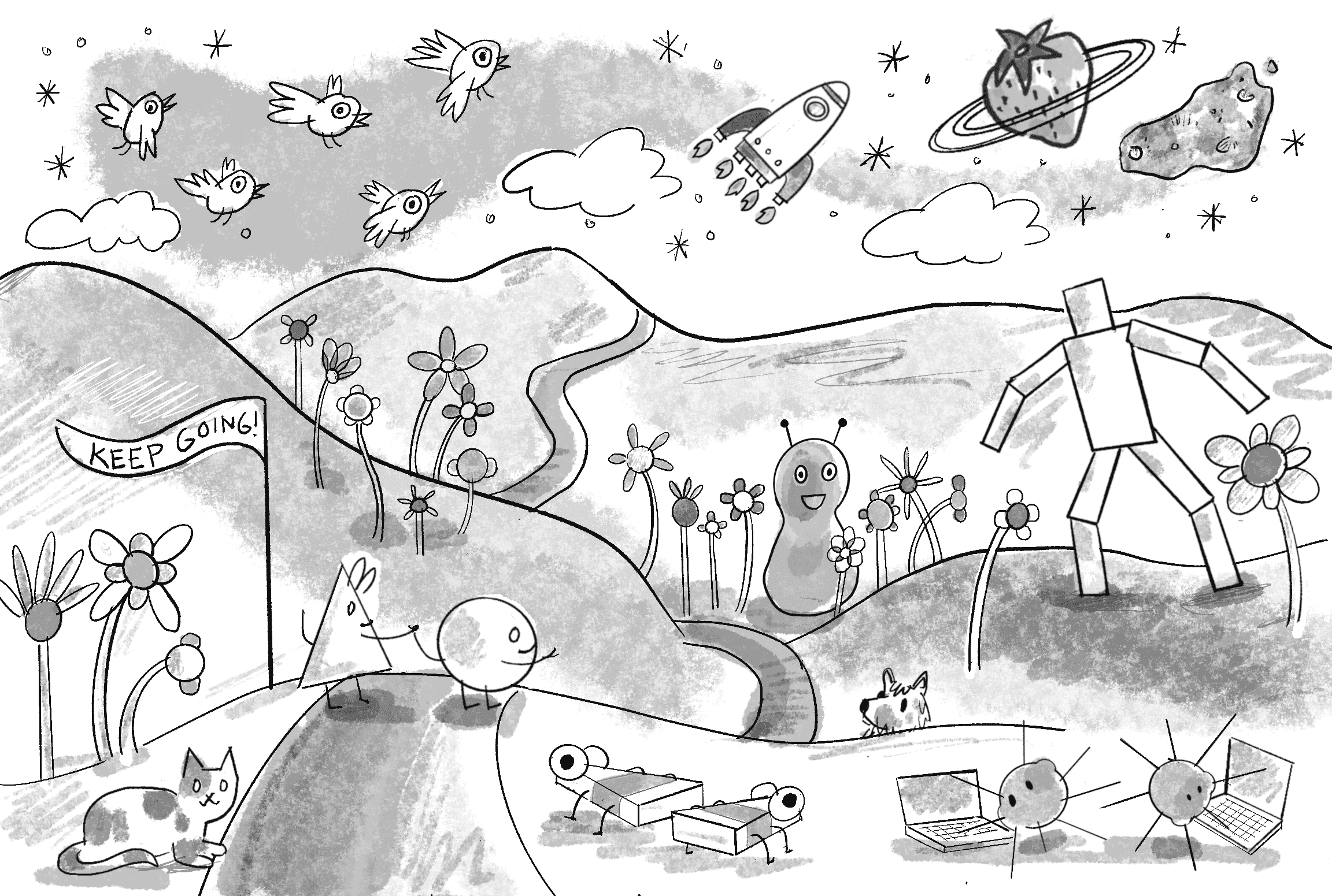 However, Chapter 10 merely scratched the surface of working with data and neural network–based machine learning—a vast landscape that would require countless sequels to this book to cover comprehensively. My goal was never to go deep into neural networks, but simply to establish the core concepts in preparation for a grand finale, where I find a way to integrate machine learning into the world of animated, interactive p5.js sketches and bring together as many of our new Nature of Code friends as possible for one last hurrah.