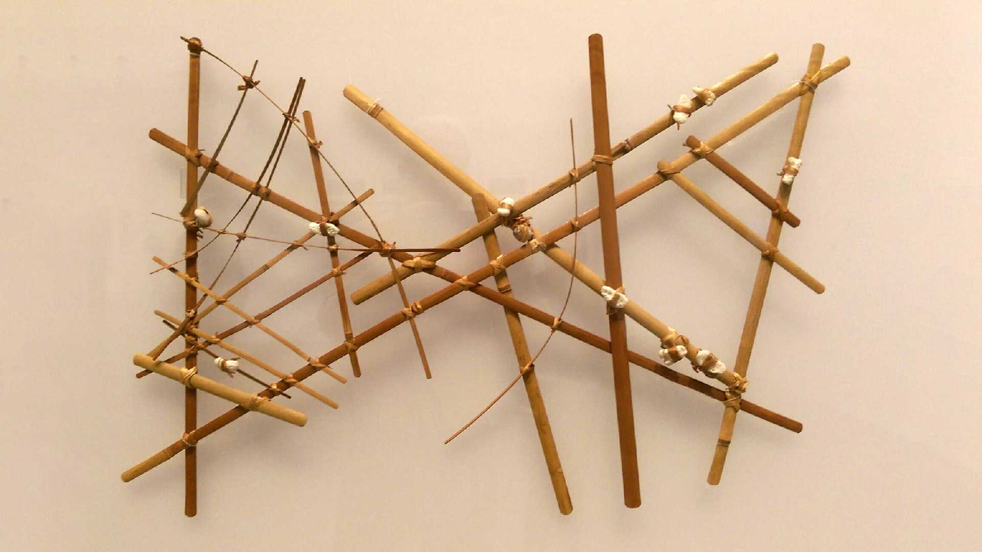 The stick chart is a navigational tool crafted by the indigenous people of the Marshall Islands, located in the central Pacific Ocean. This ancient tool was made by carefully tying together the midribs of coconut fronds. Shell markings on the chart signify the locations of islands in the region. The layout of the fronds and shells serves as a geographical guide, offering an abstract representation of vectors that capture the ocean swell patterns and their directional flow.